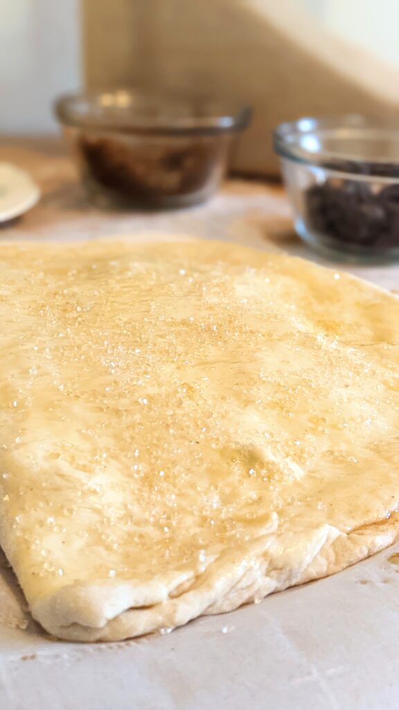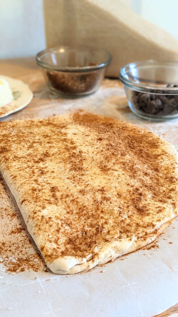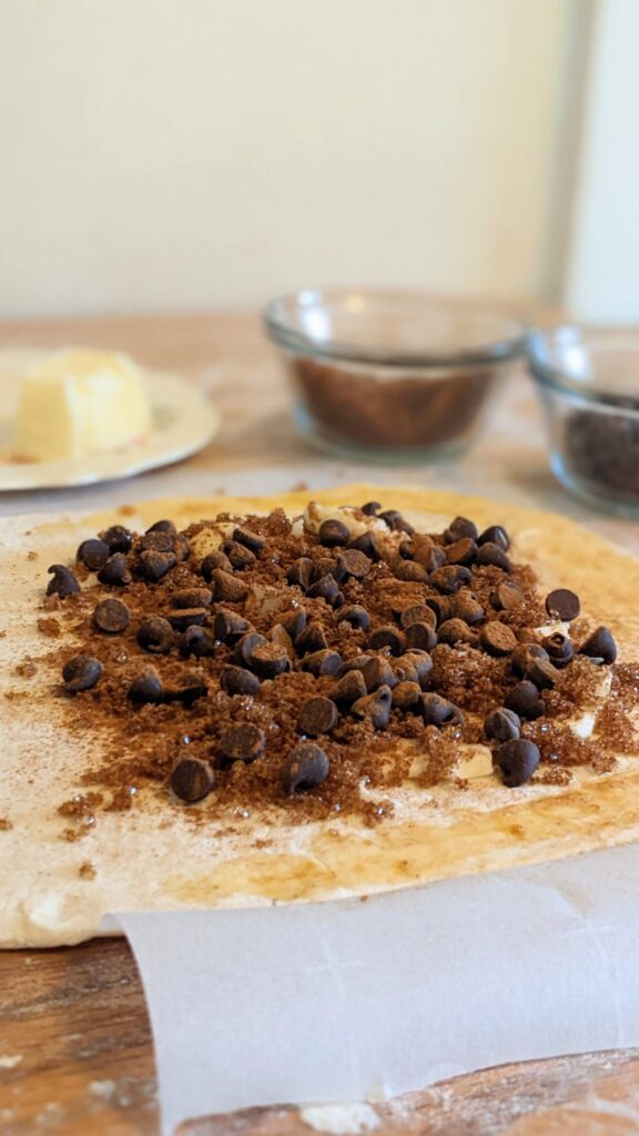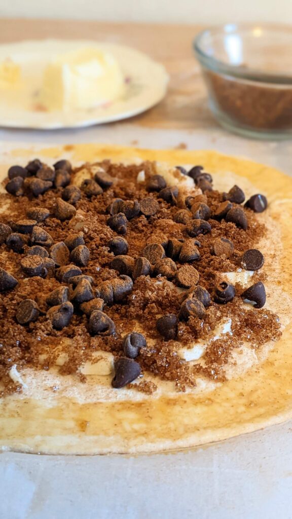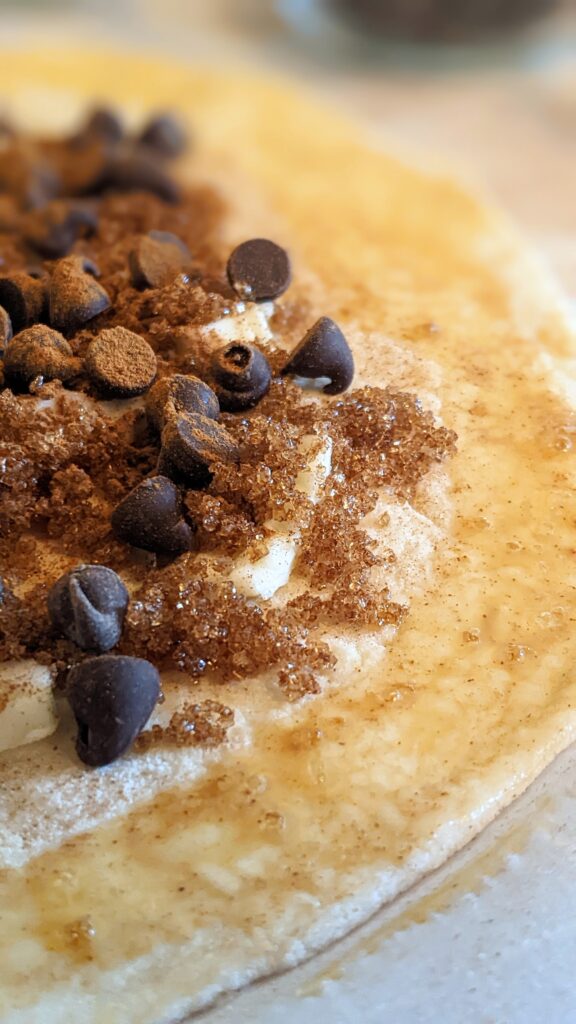 - Put Butter, Brown Sugar, Chocolate Chips and Cinnamon on 1 half of the dough. leaving about an inch on the sides for sealing.