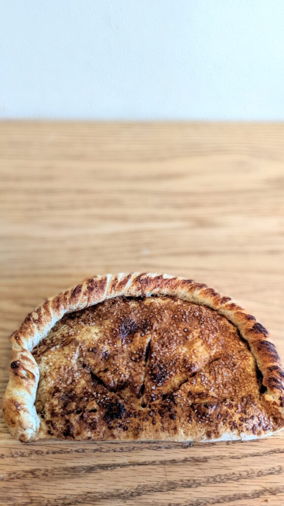 In my other calzones recipes I egg wash the top. For this dessert calzone I wanted to do a little more… Instead of the egg wash you can use butter. After the butter I sprinkled a little more cane sugar and cinnamon on the top. It was delicious!