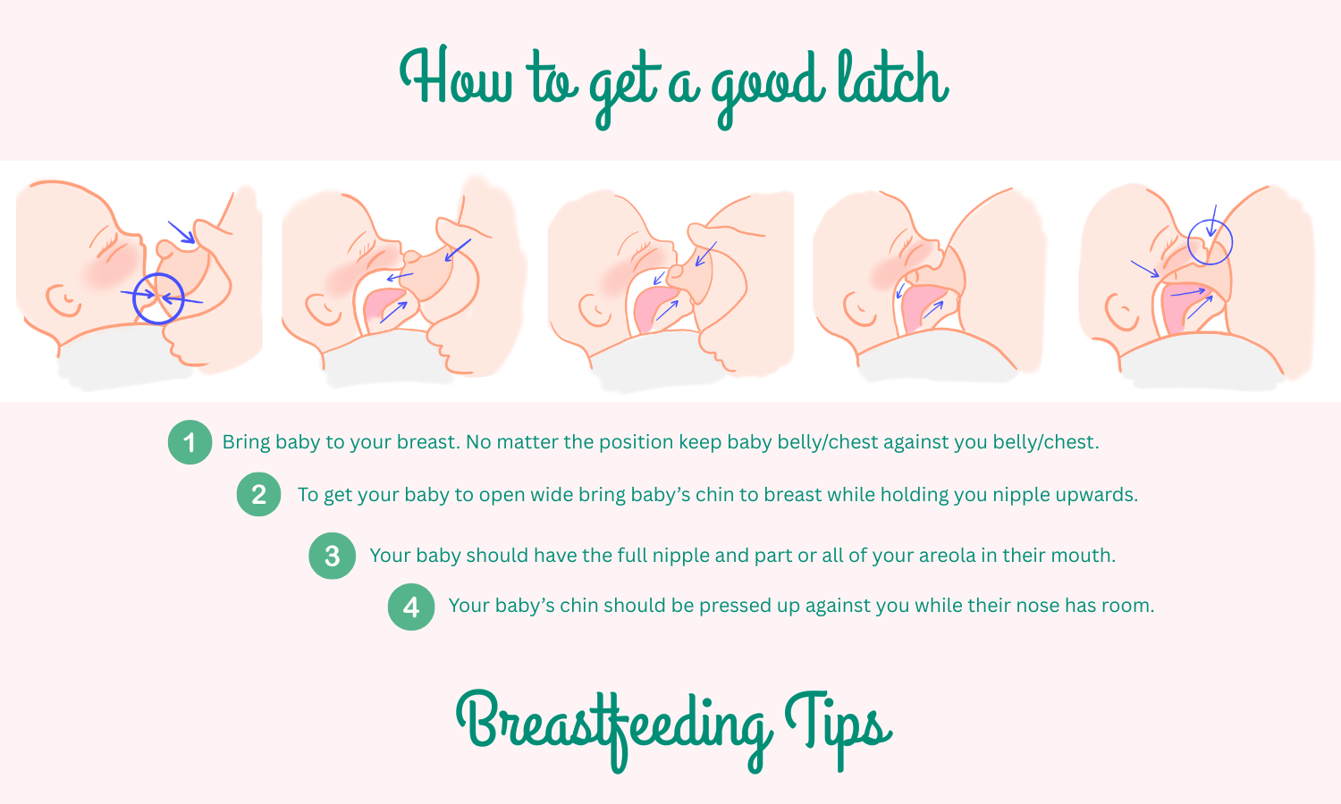 • A deep latch. If your baby has a shallow latch it will cause sore nipple pain, bad milk flow and you could get a plugged milk duct. To get a deep latch bring you baby to your breast. Guide their chin/bottom lip to your breast first. To open the baby’s mouth you can place your finger on the baby’s chin and bring it down. Bring you nipple to their upper lip/nose. Have your baby open and reach upwards to latch. This will insure a wide mouth for a deep latch.